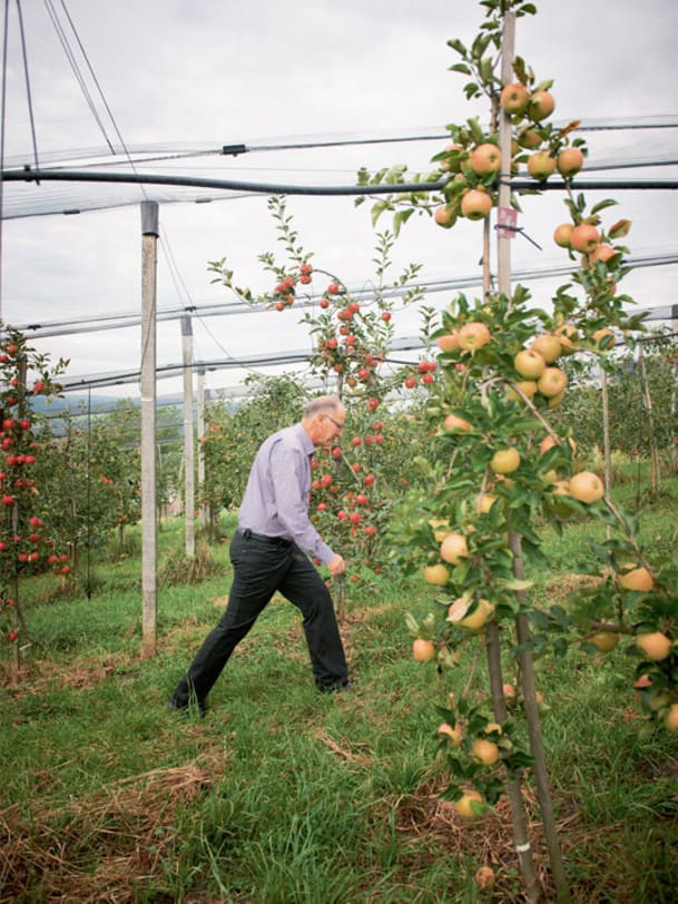 Urs Niggli eilt von einer Institutsecke zur anderen, von den Gewächshäusern – "Hier testen wir robuste Tafeltraubensorten" – zu den Obstkulturen – "Die Kirschen haben weniger Würmer, wenn man die Bäume mit Folie einpackt. Aber man empfindet das als unästhetisch, nicht wahr?" – zu den Offenställen. Eine Kuh trottet zu einer Maschine und holt sich dort ihr Futter. Das funktioniert wie am Bancomaten. Jedes Tier hat einen Chip am Kopf, auf dem die tägliche Ration Kraftfutter gespeichert ist – nicht mehr als zehn Prozent, danach gibts nur noch Gras, sagen die Richtlinien von Bio Suisse. Ist das Guthaben aufgebraucht, muss die Kuh bis zum nächsten Tag warten.