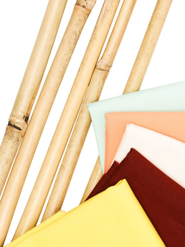 Sechs Stück Bambusstöcke à je etwa 2 m Länge, je 0.5 m von fünf verschiedenfarbigen Baumwollstoffen (Stoffbreite: 1.5 m)