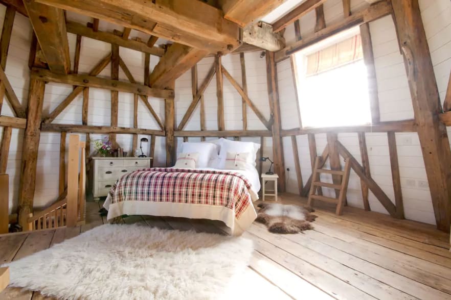 Die runden Räume und die alten Holzbalken machen die Unterkunft besonders gemütlich. Sogar das Bad ist ein Highlight!