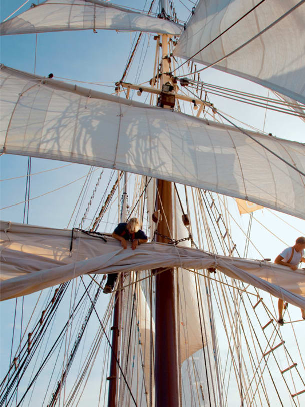 Du meine Güte, was kann diese Frau brüllen. "And – pull! And – pull! And – pull!", schreit Nicole, die Adern an ihrem Hals schwellen an wie dünne blaue Schlangen. Ziehen sollen wir, und das auf ihr Kommando. Das Brüllen hat Nicole in der kanadischen Navy gelernt. Sieben Jahre lang war sie Offizier und Bergungstaucherin bei der Kriegsmarine, als eine von fünf Frauen unter knapp 14 000 Männern. Doch für die Frage, wie es eine so attraktive Frau unter all den Supermachos ausgehalten hat, bleibt jetzt keine Zeit. Das Gaffelgrosssegel ruft. Zwölf Mann braucht es, um die drei Tonnen Stoff den Mast hinaufzuziehen. Bei schmalbrüstigen Landratten wie uns dürfen es auch gern ein paar mehr sein. Bald rast das Herz, der Schweiss rinnt aus allen Poren. Aber schlappmachen? Geht gegen die Matrosen-Ehre. "Pull!", brüllt Nicole, "and – pull! And – pull! And – pull!"