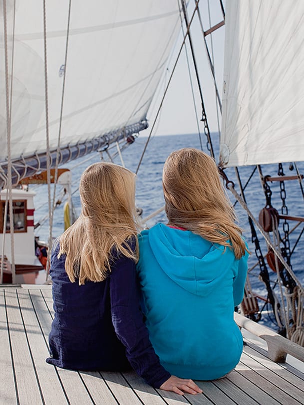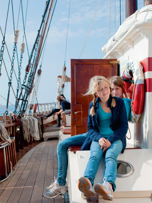 Ja, das Leben auf einem Windjammer fühlt sich manchmal richtig nach Arbeit an. Doch sind die 13 Segel erst einmal gehisst, kehrt an Bord Friede ein. Sanft gleitet das Schiff durch die See. Zu hören sind nur das Rauschen der Wellen und das Knarren der Masten. Die Passagiere dösen an Deck, durch das sanfte Schaukeln in eine Art Schlummermodus versetzt – bis Käpt’n Rony von der Brücke ruft: "Delfine backbord voraus!" und Schiffshund Paxos die Meldung mit einem lauten "Wuff!" bestätigt. Dann schrecken alle kurz hoch und bewundern das Naturschauspiel, bevor sie sich wieder dem wohligen Dämmern hingeben.
