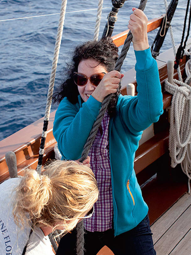 "And – pull! And – pull! And – pull!": Unsere Autorin Claudia Senn hisst mit "Admiral" Nicole die Segel.