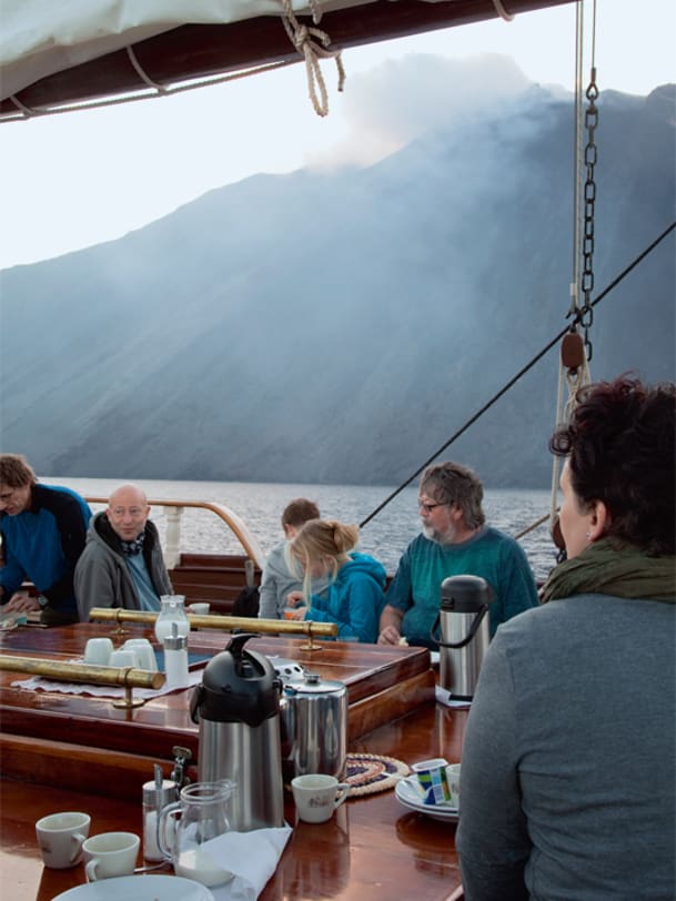 Montag früh, die Segel sind gehisst, das Schiff schaukelt gemächlich in Richtung Panarea. Alle haben wir eine unruhige erste Nacht hinter uns. Denn unser Schiff ist zwar eine schöne alte Lady, doch der Komfort ist leider auch von gestern. Die Kabinen unter Deck sind so winzig, dass man sich kaum darin umdrehen kann. Jede ist mit einem Mini-Lavabo und einem Bonsai-Schränkchen, das für die Garderobe einer Barbiepuppe gezimmert zu sein scheint, ausgestattet. In die Kajütenbetten hineinzuklettern, erfordert die Beweglichkeit eines Schlangenmenschen. Unser ebenso beleibter wie humorvoller Mitpassagier Rüdiger findet den passendsten Ausdruck für seine Koje: Er nennt sie nur den "Kindersarg". Schlimmer noch als die Platzverhältnisse ist die Geräuschkulisse. Denn die dünnen Kabinenwände reichen nicht bis zur Decke, und so haben wir die erste Nacht hauptsächlich damit verbracht, der kakofonischen Schnarchsinfonie unserer Reisegefährten zu lauschen.