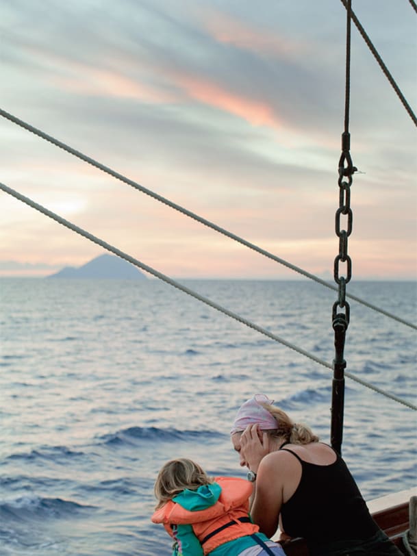 Bald stinkt es widerlich nach faulen Eiern. Wir nähern uns Vulcano mit seinen heissen Bädern, Schwefelquellen und karstigen Mondlandschaften. Jaden und Amber spielen an Deck mit ihren "It-Bags", Mini-Handtäschchen in Pink und Orange. Beide kamen schon wenige Tage nach der Geburt auf die "Florette". Weder ihre Eltern noch Melissa, die Nanny, haben ständig ein Auge auf die Kinder. Im Vergleich zu den überbesorgten Eltern auf einem Schweizer Durchschnitts-Spielplatz wirken sie geradezu demonstrativ entspannt. "Was soll schon passieren?", sagt Nicole, "die Mädchen tragen ja ihre Schwimmwesten." Jaden, die Ältere, klettert sogar manchmal in die Takelage, mit einem Klettergurt gesichert wie die erwachsenen Matrosen. "Wer es schafft, eine Rutschbahn hinaufzuklettern", findet Rony, "für den ist auch die Takelage kein Problem."
