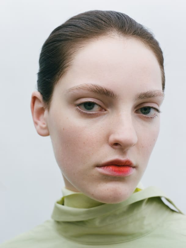 Lidschatten in zarter Farbe oberhalb der Augenfalte auftragen und die Wimpern natürlich lassen. Ein intensiver glossy Lippenstift vervollständigt den Look.