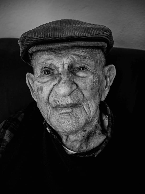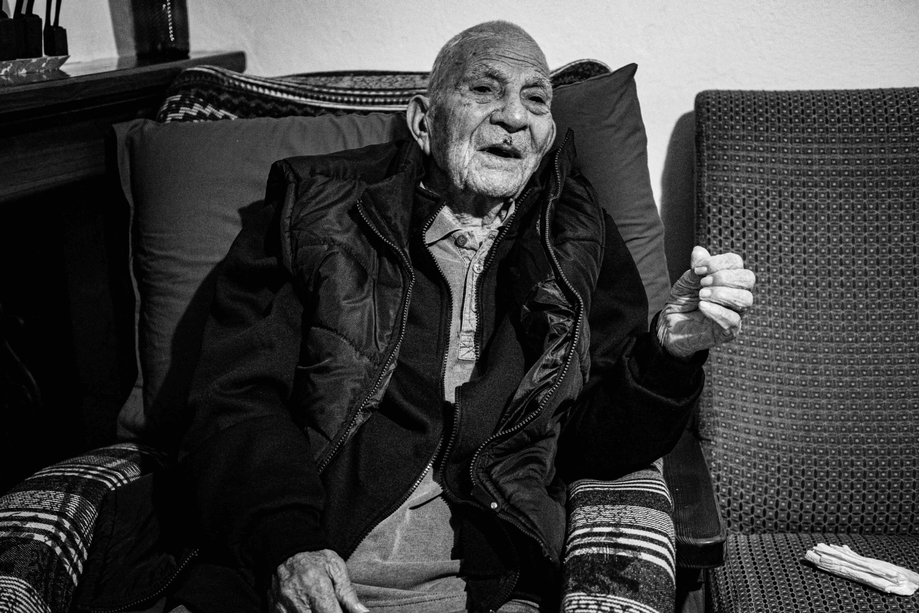 "Oh! Auf wen willst du denn schiessen, junger Mann?", sagt Efisio Taccori aus Teulada amüsiert, als der Fotograf das Stativ vor ihm aufbaut. Taccori ist zum Zeitpunkt unseres Besuchs erst vor ein paar Tagen hundert geworden. Er zeigt uns stolz ein Foto von sich, vor einer riesigen Torte, beide Daumen in die Höhe gestreckt. Dann kauert er sich wieder in den Sessel. Mit eingezogenem Kopf und verschränkten Armen, die Hände unter die Achseln geschoben, um sie warm zu halten, lehnt er seitlich an der Armlehne. Seine Tochter erklärt uns, diese kauernde Haltung sei die Position gewesen, in der Wanderhirten wie er Unwettern trotzten.