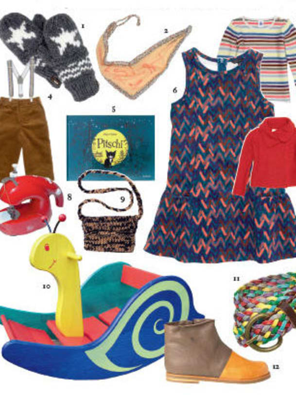 1 Handschuhe von Barts 49.80 Fr. bei Tigerfink 2 Nuggitüechli 58 Fr. von Ikou Tschüss 3 Pullover 119 Fr. von Le Petit Bateau 4 Cordhose mit Hosenträgern 105 Fr. von En Soie 5 "Pitschi" 25.90 Fr. bei Orell Füssli 6 Kleidchen ca. 140 Fr. von Little Marc 7 Strickjacke 109 Fr. von Kookaï 8 Handnähmaschine von Smartek USA 35 Fr. bei www.galaxy713.com 9 Tasche zum Selberstricken von Wool & The Gang ca. 70 Fr. bei www.woolandthegang.com 10 Schaukelschnecke von Bisal 139 Fr. bei www.4mybaby.ch 11 Flechtgürtel von Scotch R’Belle 49.80 Fr. bei Tigerfink 12 Schuhe von Nathalie Verlinden 160 Fr. bei Nepomuk