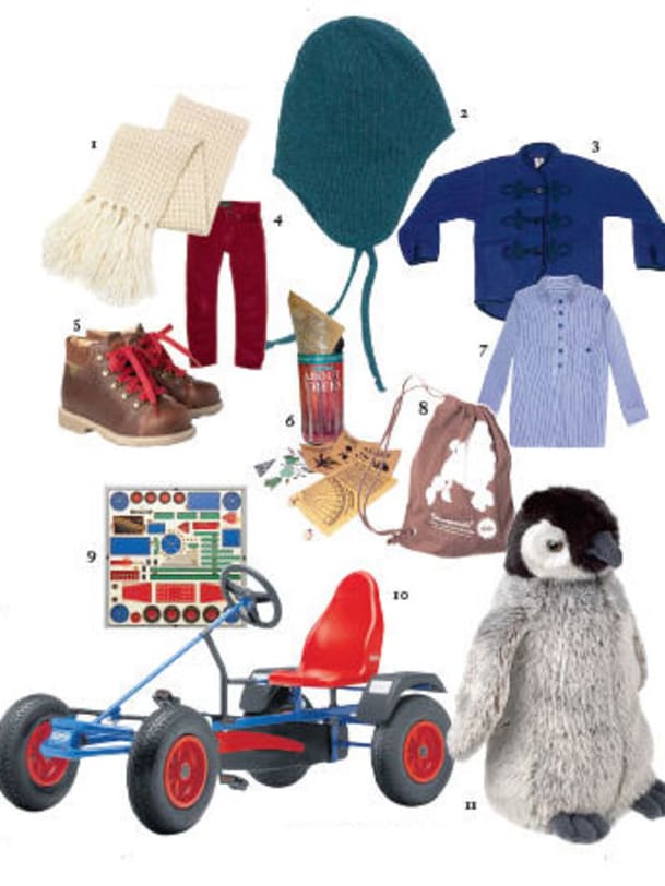 1 Schal von Aymara 63 Fr. bei Nepomuk 2 Mütze 23 Fr. von American Apparel 3 Jacke von Shampoodle ca. 50 Fr. bei www.shampoodle.com 4 Hose von Finger in the Nose 81 Fr. bei www.zirkuss.com 5 Schuhe von Chavat 130 Fr. bei Walder 6 Baumforscher-Kit von Flights of Fancy 20 Fr. bei www.galaxy713.com 7 Hemd 43 Fr. von Nepomuk 8 Beutelrucksack von Shampoodle bei www.shampoodle.com, Preis auf Anfrage 9 Metallbaukasten von Manufactum 239 Fr. bei www.manufactum.ch 10 Gokart 629 Fr. von www.gokart-shop.ch 11 Pinguin von WWF 24.90 Fr. bei Franz Carl Weber