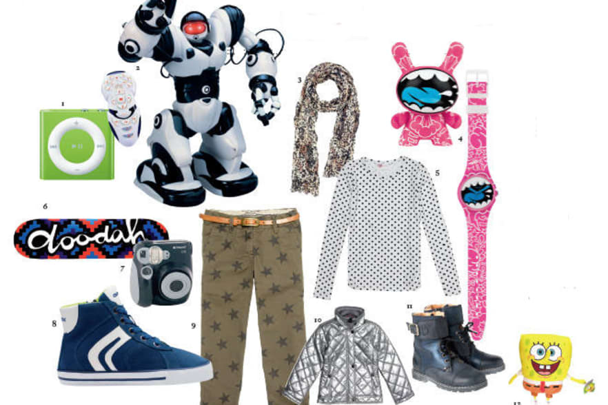 1 iPod Shuffle von Apple 49 Fr. bei www.store-apple.com 2 Ferngesteuerter Roboter von Wow Wee ca. 75 Fr. bei www.mytoys.de 3 Schal mit Leopardenprint von Globus Accessoires 12.90 Fr. bei Globus 4 Uhr mit Spielfigur 70 Fr. von Kidrobot for Swatch 5 Langarmshirt von Inside 14.90 Fr. bei Manor 6 Skateboard von Doodah 79 Fr. bei www.doodah.ch 7 Kamera von Polaroid 198 Fr. bei www.geschenkidee.ch 8 Turnschuhe 79 Fr. von Geox 9 Hose von Scotch R’Belle 129.90 Fr. bei Tigerfink 10 Steppjacke von Fadeout 79.90 Fr. bei Globus 11 Boots von Momino 190 Fr. bei Walder 12 Plüsch-Sponge-Bob 52.90 Fr. von www.funshop.ch