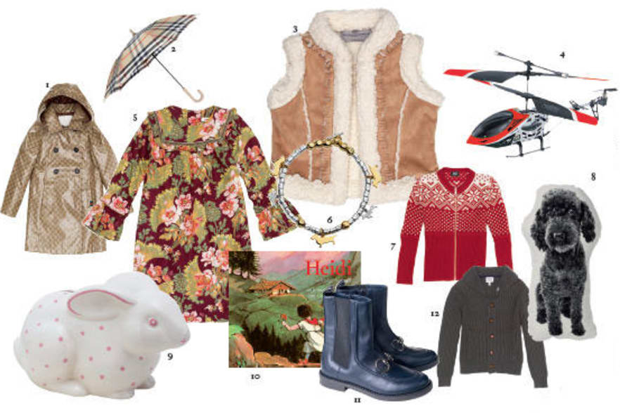 1 Regenmantel ca. 140 Fr. von Gucci 2 Regenschirm von Burberry 165 Fr. bei www.ch.burberry.com 3 Gilet 260 Fr. von Ermanno Scervino 4 Ferngesteuerter Helikopter 79 Fr. von ww.geschenkidee.ch 5 Kleid ca. 115 Fr. von Kenzo 6 Bracelet ca. 3345 Fr. von Dodo 7 Norwegerstrickjacke ca. 170 Fr. von D&G 8 Kissen mit Aufdruck von Areaware ca. 60 Fr. bei www.yoox.com 9 Sparhäschen 120 Fr. von Tiffany & Co. 10 "Heidi"-Hörspiel 57.90 Fr. bei www.cede.ch 11 Lederstiefel von Gucci, Preis auf Anfrage 12 Strickjacke ca. 180 Fr. von Armani Junior