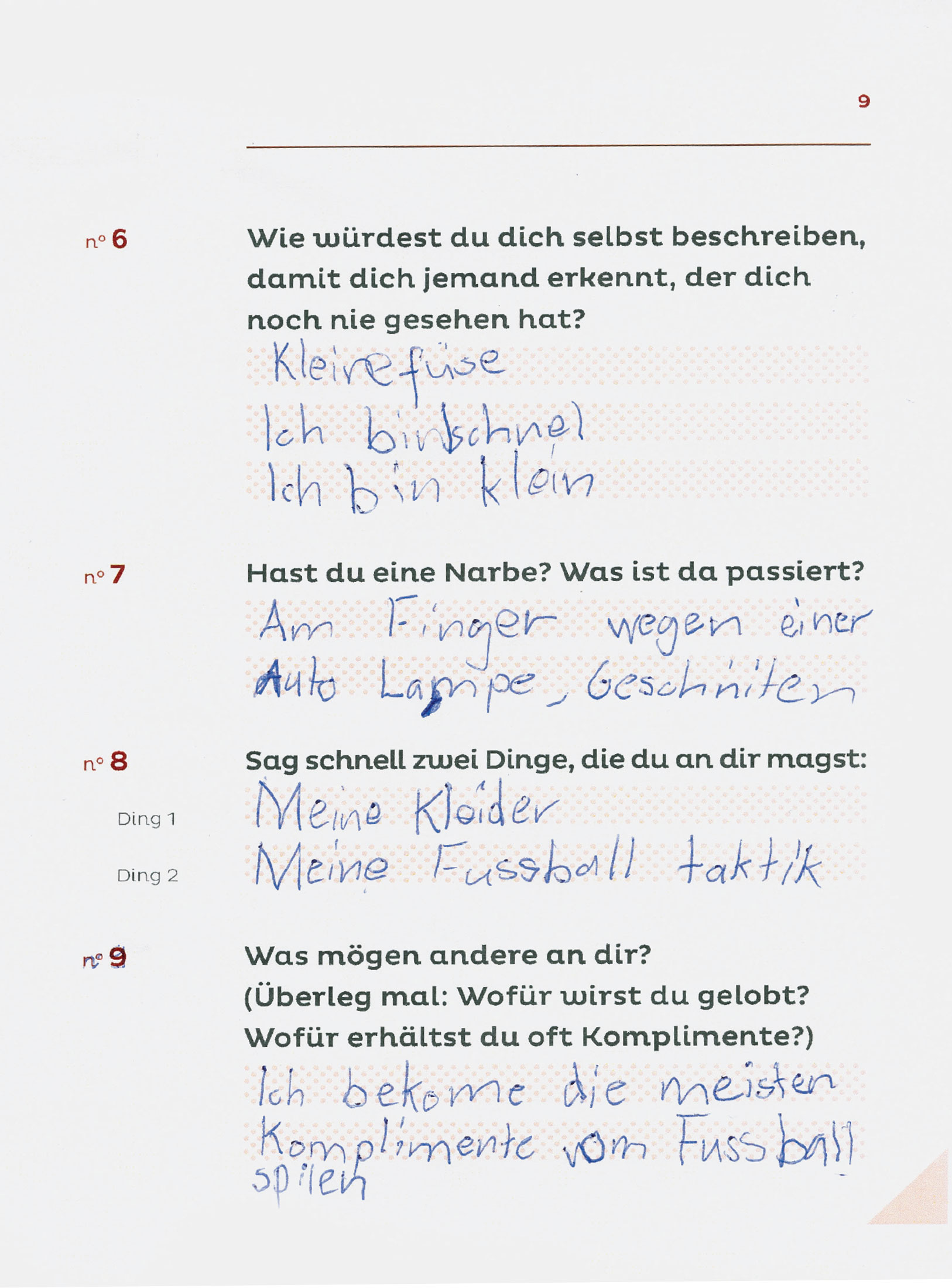 "Komm!", sagte ich zu meinem Sohn aufmunternd, rubbelte ihm zur geistigen Belebung das Deckhaar, "macht doch Spass!", dann reichte ich ihm das Buch und einen Stift – und er fing an, die Fragen zu beantworten. Widerwillig zwar, aber immerhin. "Wie heisst du?" – "Wie heisst du rückwärts?" – "Hast du Spitznamen?" – … So weit, so gut. Bei der sechsten Frage jedoch begann es bereits zu harzen. "Wie würdest du dich selbst beschreiben, damit dich jemand erkennt, der dich noch nie gesehen hat?" Mein Sohn rümpfte die Nase. Hausaufgaben, also doch. Er studierte. Und studierte. Er studierte so lange, bis ich den Glauben daran verlor, dass er überhaupt noch irgendwas studierte – irgendwann meinte ich nett wie die Stimme aus dem Off in der "Sendung mit der Maus": "Schreib, was dir in den Sinn kommt. Es gibt kein Falsch und kein Richtig" – und dann schrieb er: "kleine füse" …