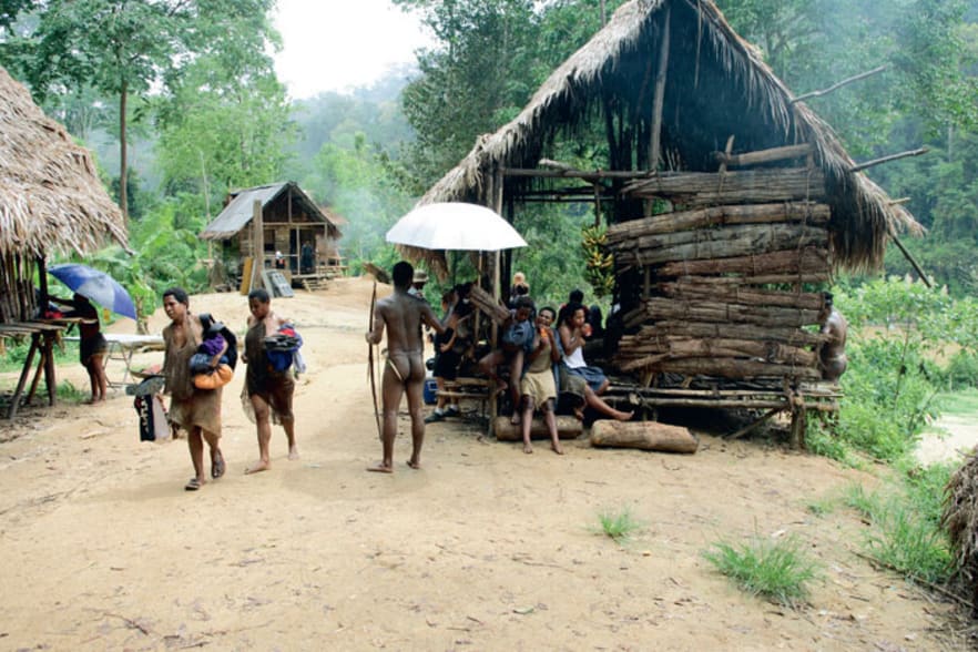 Nicht nur die Nahrungsgewohnheiten seien beim Stamm der Fayu anders, erklärt das Dschungelkind und schaut mit wasserblauen Augen in die Runde. "Wenn man sich mag, nimmt man den Finger des anderen in den Mund und kaut darauf herum, ganz liebevoll." Nadja Uhl schiebt ihre Hände unauffällig unter die Oberschenkel. Auch die drei kleinen, muskulösen Männer, die im Lendenschurz, mit Federgürtel und Knochenkette geschmückt, neben Sabine hocken, schauen verwundert. Sie gehören zu den 85 Laienschauspielern, die aus Papua eingeflogen wurden und die Ureinwohner verkörpern. Doch sie sind keine echten Dschungelkinder. Die meisten von ihnen leben in Städten, verdienen ihr Geld als Polizisten, Lehrer und Verkäufer. Robin Lavulu (50), der einen alten Krieger spielt, ist Uniprofessor. Für ihn und die anderen sind die alten Riten und Tänze Folklore, sie sprechen – im Gegensatz zu den Fayu – fliessend Englisch.
