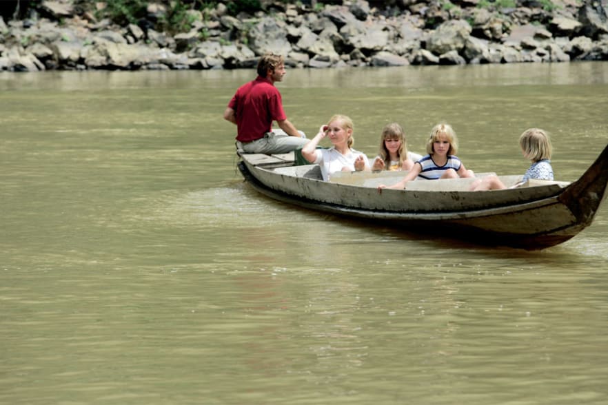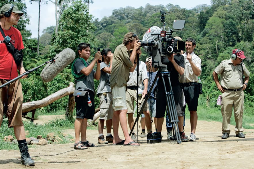 Doch auch wenn die Knochen am Set aus der Requisitenkiste kommen, ist der Light-Dschungel für das Filmteam ein Abenteuer. Morgens, wenn die Sonne noch niedrig steht und der Frühnebel träge aus dem Regenwald steigt, werden die Schauspieler und die Crew mit Langbooten vom Hotel abgeholt und den breiten, braunen Fluss hinauf zum Drehort gefahren. Nadja Uhl und Thomas Kretschmann sitzen noch verschlafen auf den schmalen Holzsitzen und tuckern vorbei am grünen Dickicht des eineinhalb Millionen Jahre alten Walds. Urwaldriesen ragen majestätisch in den Himmel, Nasenaffen schwingen sich durch die Wipfel, zwei Blauscheitelpapageien streiten sich lautstark um ein Weibchen.