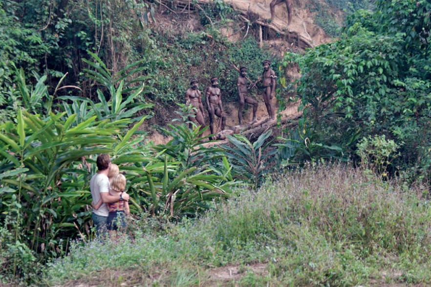 Filmstill: Die Missionarsfamilie trifft auf die eingeborenen Fayu