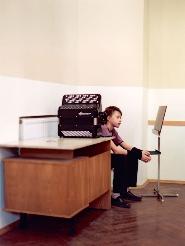 Das Zimmer ist ordentlich. Stepan teilt es mit Boris und Lech. Es ist schmal und lang mit einer sehr hohen Decke, zwei Etagenbetten aus der Sowjetzeit und einem alten Klavier. Über dem Lavabo ein Motorradkalender vom Vorjahr. Stepan ist elf Jahre alt und lebt seit zwei Jahren im Internat der Spezialmusikschule. Der Vater arbeitet in einer Fabrik in Moskau, die Mutter ist Sozialhelferin. Sie schenkten ihm ein russisches Akkordeon, ein Bajan, als er sechs Jahre alt war. Und als seine Finger nach kurzer Zeit so mühelos über die Knöpfe tanzten, als gäbe es nichts Selbstverständlicheres auf der Welt, fuhren sie mit ihm nach St. Petersburg und liessen ihn an der Spezialmusikschule des berühmten Rimski-Korsakow-Konservatoriums vorspielen, dem ältesten Musikinternat der Welt.