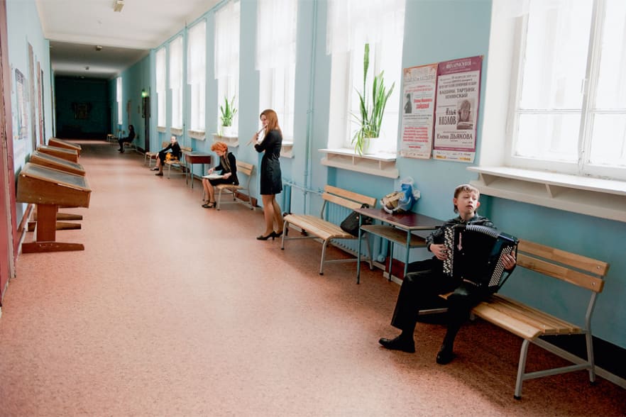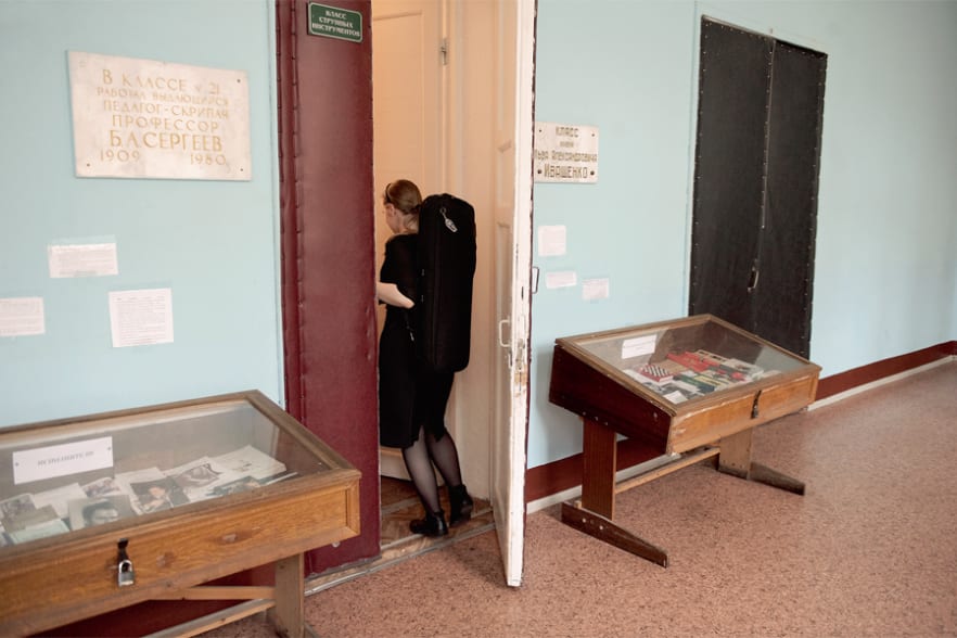 Stepan hat sich sein Akkordeon umgeschnallt. Er macht sich auf den Weg zum Unterricht. Von den Wänden der Korridore blättert hellblaue Farbe. Tonleitern, Kadenzen und Melodien purzeln aus den Übungszimmern durch die leeren Gänge, an den Wänden reihen sich die Porträts ehemaliger Direktoren und berühmter Komponisten. Früher brachte man hochbegabte Kinder wie Stepan oder Boris oder Lech aus ganz Russland nach St. Petersburg ins Musikinternat. Staatlich finanzierte Frühförderung – ein Relikt aus grauer Sowjetzeit, als ein begnadeter Geiger noch das Ansehen eines Astronauten oder Olympiasiegers genoss. Damals gab es eine Kommission mit dem einzigen Auftrag, in den Provinzmusikschulen des Landes Talente aufzuspüren.