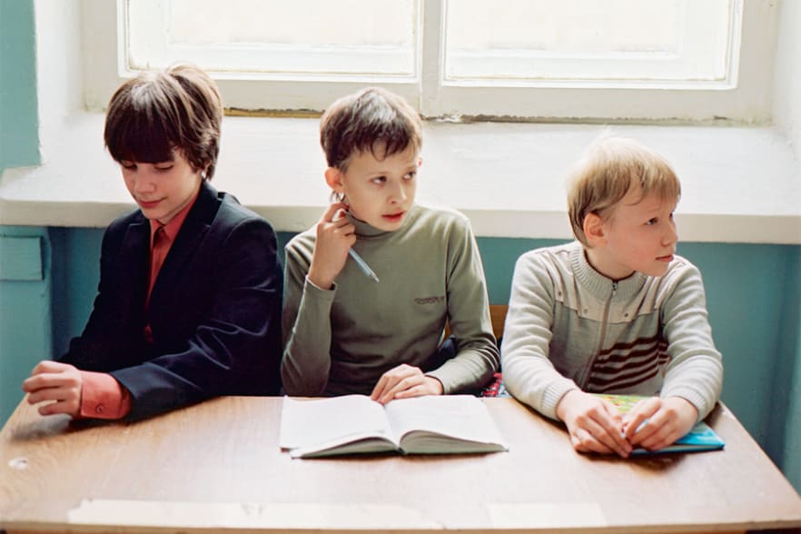 Mittagstisch in der Schulkantine. Es gibt Borschtsch, Kartoffeln, Hühnchen, Salat, Schwarzbrot und Butter. Viele Buben tragen Tuchhose oder Anzug, die Mädchen Jupe und Bluse. Walentina Fedoseewa, die Direktorin mit der schrillen Kopfstimme, eilt von Tisch zu Tisch und vergewissert sich, dass nichts in den Tellern liegen bleibt: "Wladimir, iss deine Suppe auf! Was ist los, Marinka, warum lässt du den Salat stehen! Alex, du fällst noch von den Knochen!"