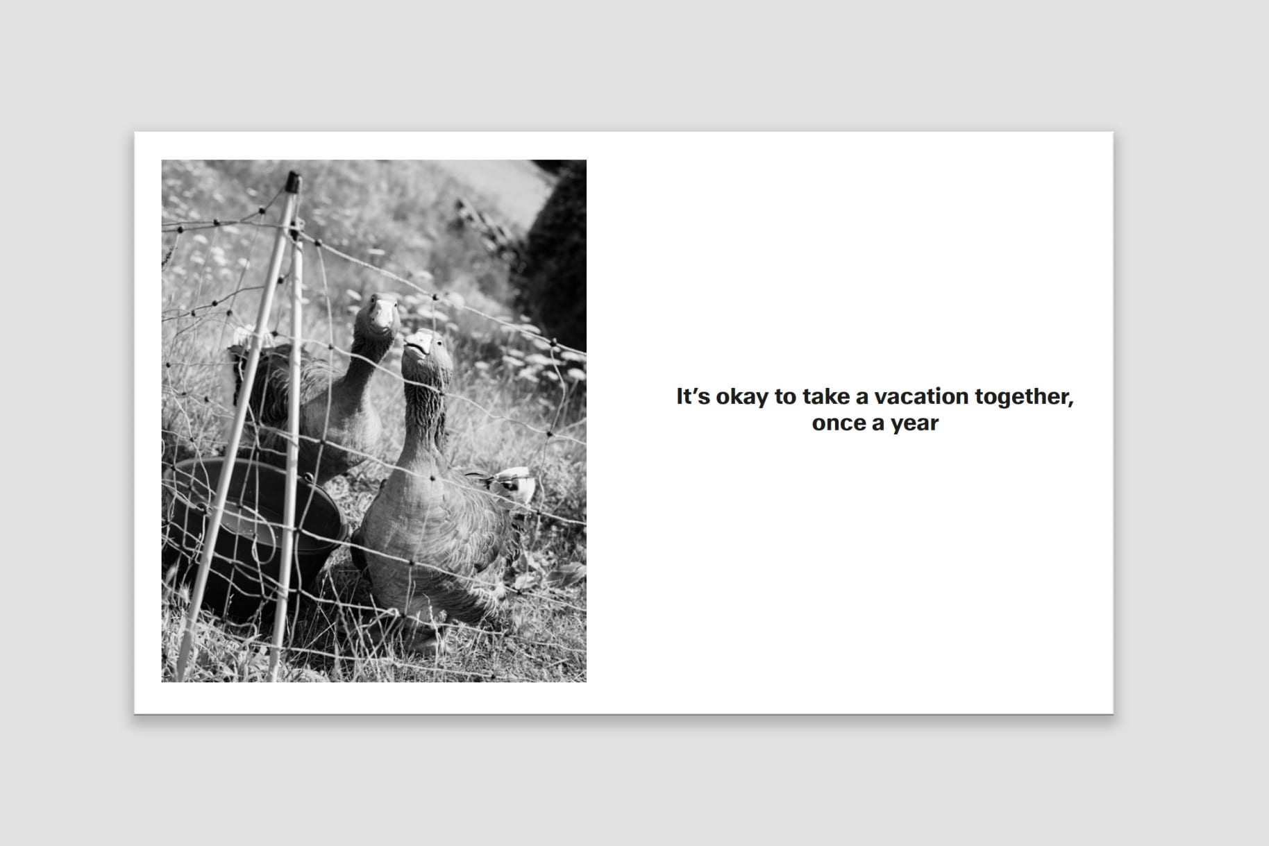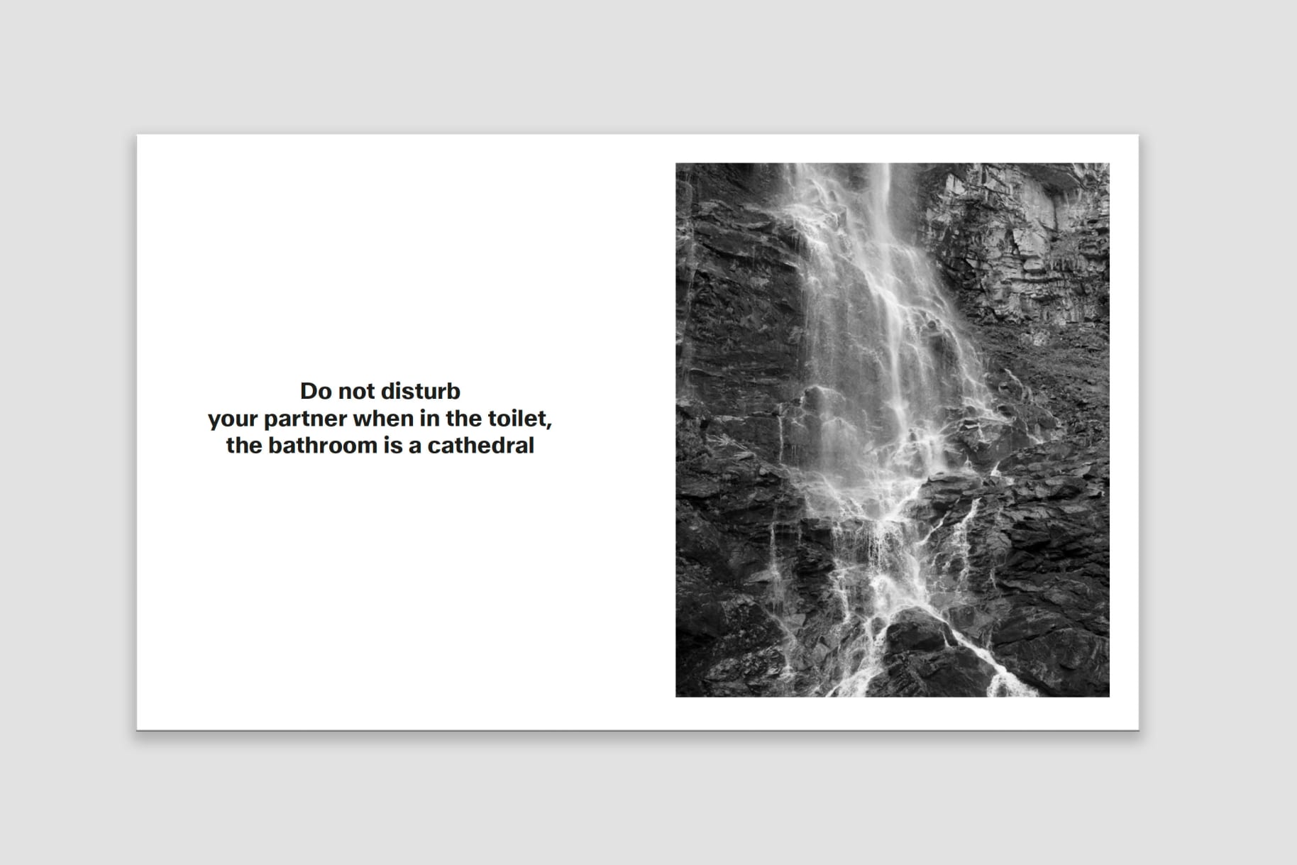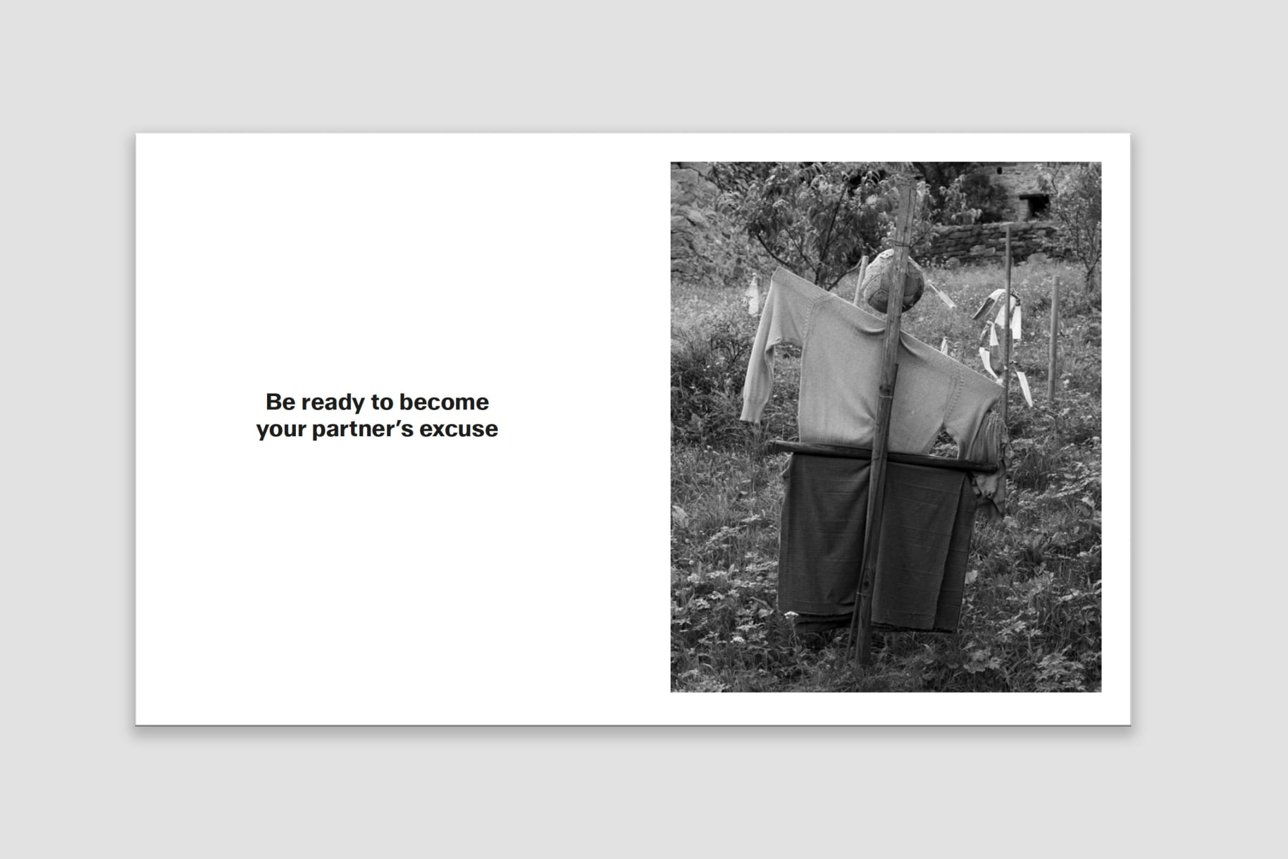 Das Buch zum Werk – entstanden während einer Residency – hinterfragt spielerisch die bisher ungeschriebenen Gesetze des Zusammenlebens und dient als englischer Ratgeber für Paare.