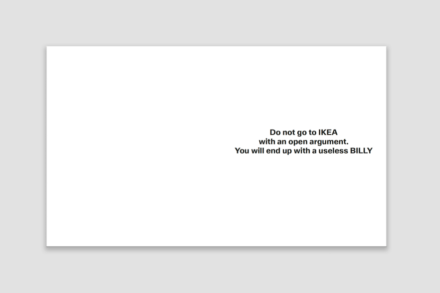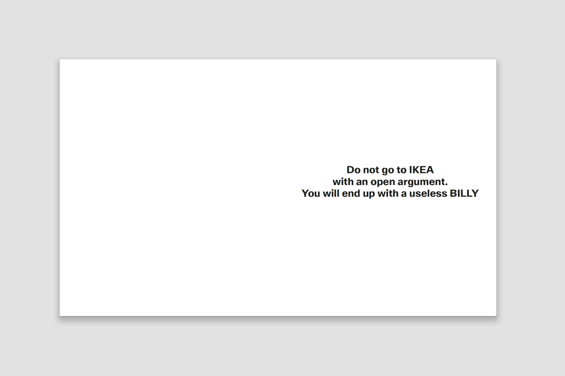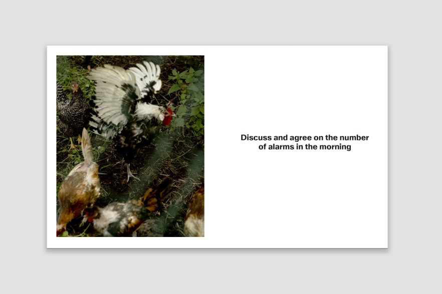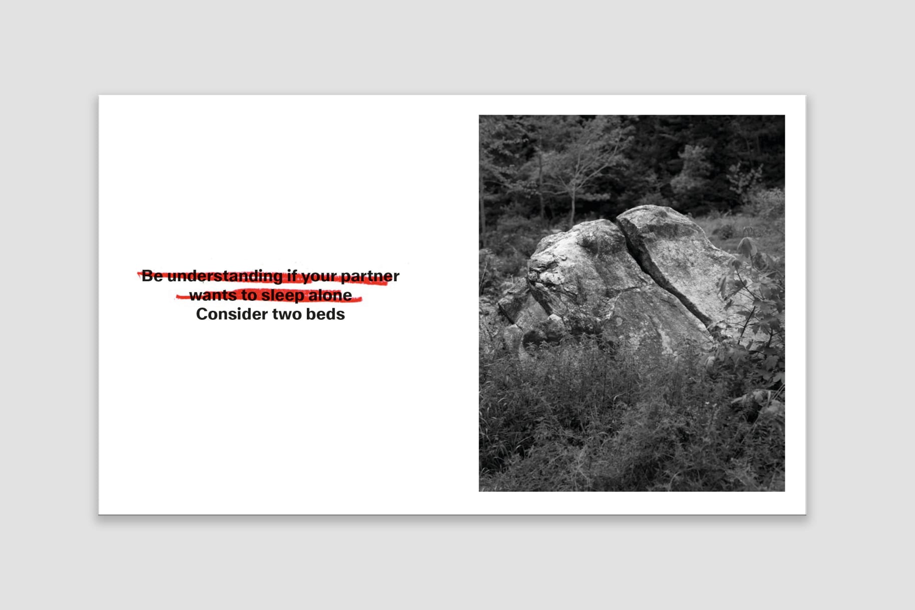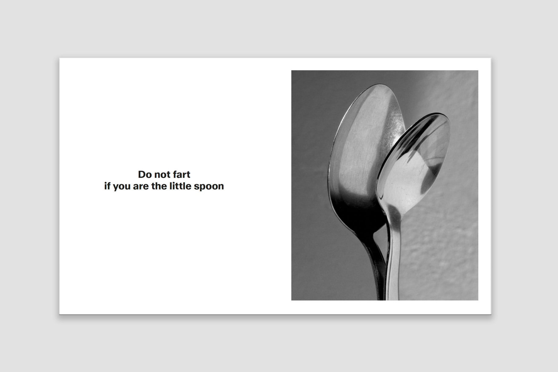 Das Buch zum Werk – entstanden während einer Residency – hinterfragt spielerisch die bisher ungeschriebenen Gesetze des Zusammenlebens und dient als englischer Ratgeber für Paare.