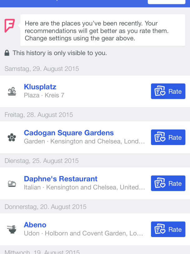 Von der App registrierte Besuche speichert Foursquare unter "History". Nachträglich können sie bewertet und als Liste gespeichert werden.
