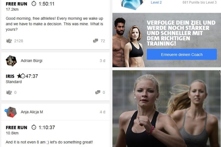 Weil Freeletics auch mit Facebook verknüpfbar ist, können Ziele und Trainingseinheiten in einem Social-Feed mit allen Freeletics-Teilnehmern geteilt werden. Gefällt jemandem die Trainingsleistung, kann dieser den Post mit einem Handschlag belohnen oder einen Kommentar hinterlassen. Ebenfalls besteht die Möglichkeit, Freunden und anderen Mitstreitern zu folgen. Besondere Motivation: Jede Übung ergibt Punkte, die einen auf ein höheres Level bringen. In der Freeletics-Community gilt somit: Je höher das Level, desto besser die Fitness.