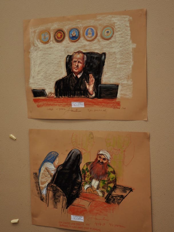 … nennt Janet Hamlin ihre Arbeit. Oben: Richter Pohl. Unten: Der rotbärtige KSM bespricht sich mit Anwältinnen (in Schwarz Cheryl Borman), die aus Rücksicht auf die Gefangenen verschleiert sind
