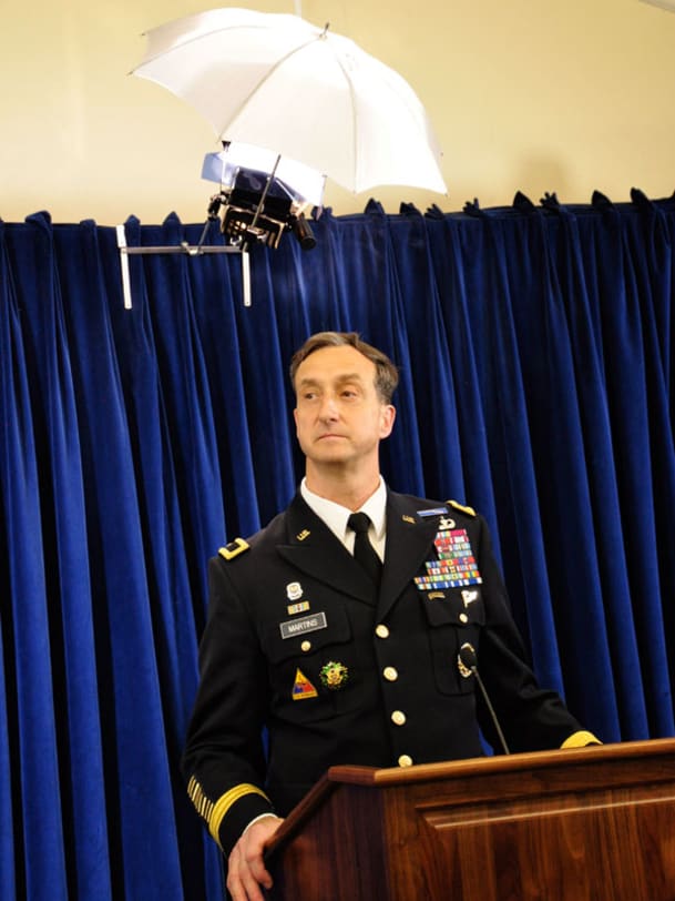 Staatsanwalt Army Brigadier General Mark Martins beantwortet im Media Operation Center die Fragen der angereisten Journalisten