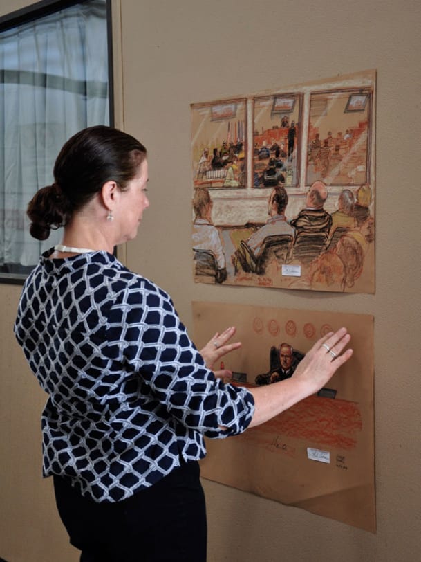 Janet Hamlin macht mit ausschweifenden Bewegungen die ersten Striche. Hält in Braun das Richterpult fest, die Wappen von Army, Air Force, Marines und Navy, die Anordnung der Bankreihen, die Position der Anwälte. Es ist wichtig, sagt sie, ohne ihren Blick abzuwenden, als Erstes das Ganze zu erfassen, "the big picture". Danach könne sie darauf reagieren, was im Gerichtssaal passiert, das Bild redigieren. "Visual journalism", sagt sie.