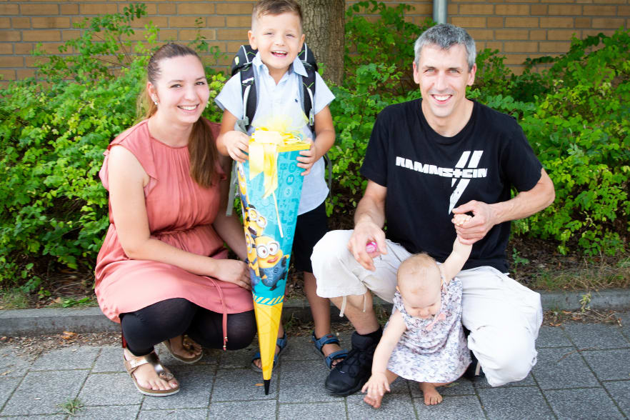 Glückliche Familie: Danijela und Nico Woschofius mit Jamie, der jetzt ein stolzer Schüler ist, und dem Töchterchen.