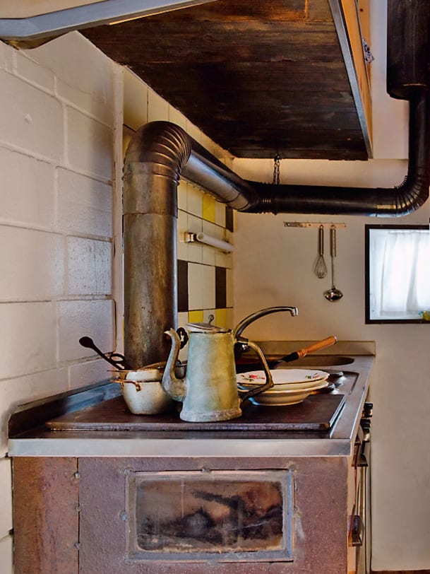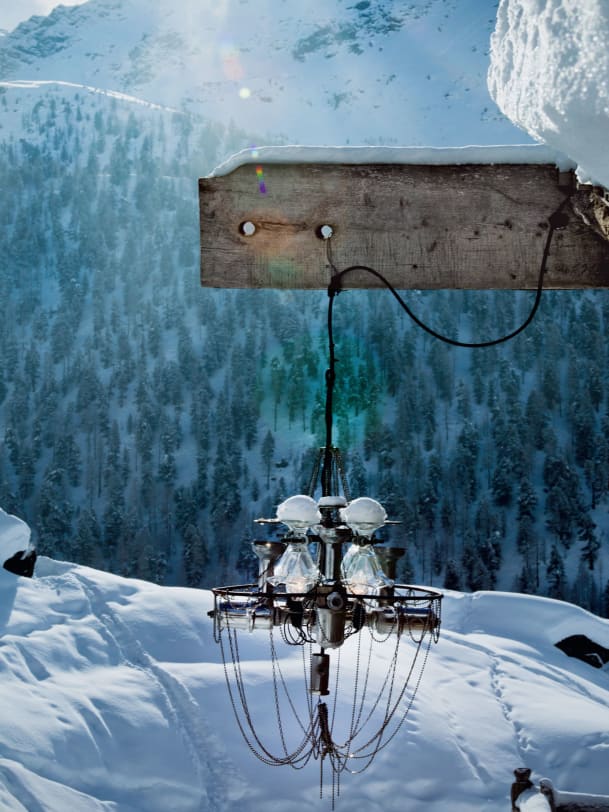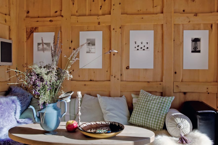 Etwas weiter unten am Hang führt Schwester Vrony das Restaurant Chez Vrony. Gleich neben dem Atelier teilt sie sich mit den beiden anderen Julen-Schwestern und ihren Familien zwei Chalets. Und dann ist da noch – hinter eine Schneewächte geduckt und leicht zu übersehen – das Bienenhäuschen. Es heisst so, weil es früher einmal genau das war. Das kleine Haus ist etwa 150 Jahre alt, es hat Julens Grossvater gehört. Doch ein nächtlicher Besuch betrunkener Randalierer vertrieb das Bienenvolk für immer, Heinz und sein Vater bauten die kleine Hütte um: eine Miniküche, ein Minibad, Einbautisch und -bank mit Stauraum darunter, riesige Panoramafenster. Es ist eine einfache und besondere Unterkunft für befreundete Künstler und auch für Heinz manchmal. Vor allem im Herbst, wenns kalt wird. "Es dauert ewig, das Atelier zu heizen. Deshalb übernachte ich oft im Bienenhäuschen, dort ist es immer warm." Dafür sorgen massive Holzwände und eine Grundfläche von lediglich 12 Quadratmetern, ausserdem ist das Findeltal das wärmste Tal im ganzen Kanton. Die Sonne verschwindet im Winter nie ganz hinter dem Breithorn, ganz knapp schafft sie es obendrüber.