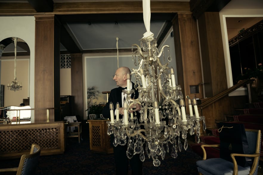 Die acht Kronleuchter im Speisesaal werden heruntergelassen, um die Kristalle und Glühbirnen zu polieren