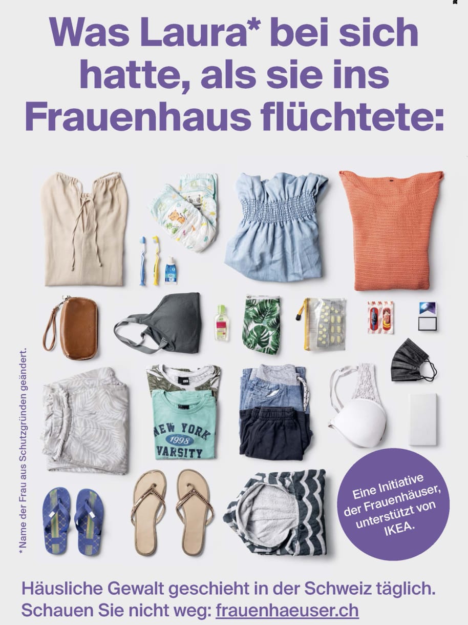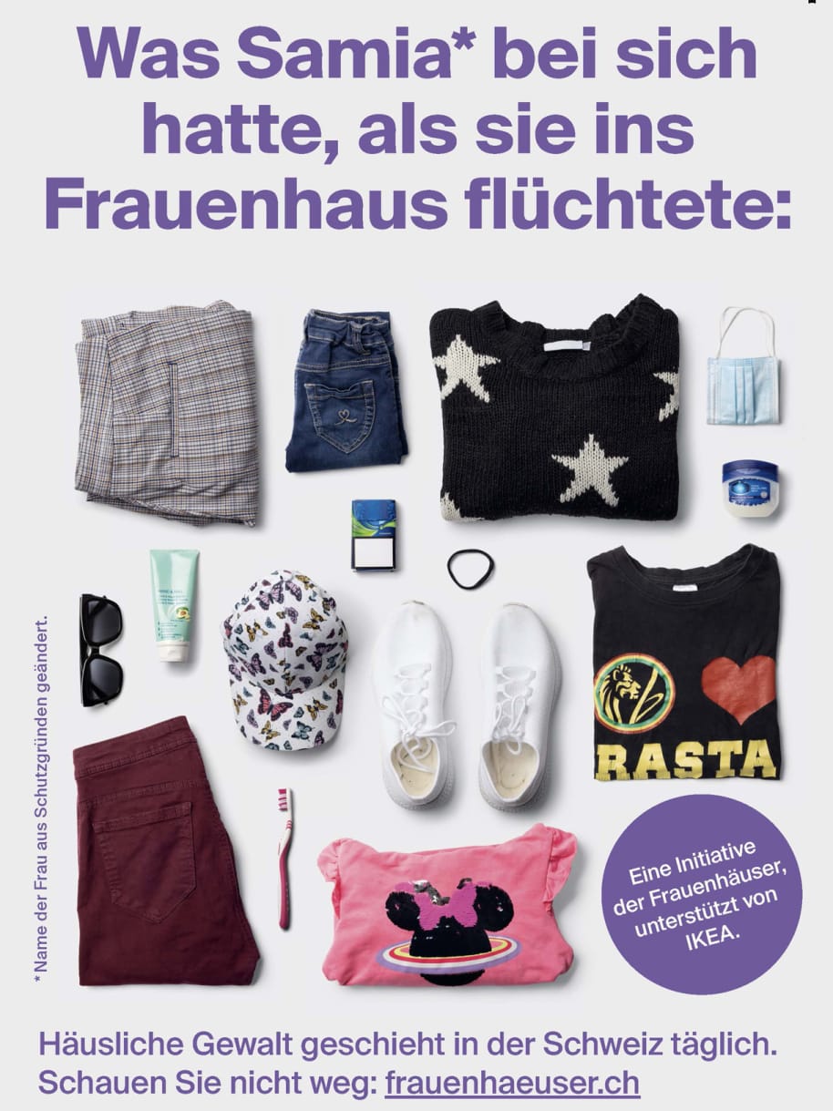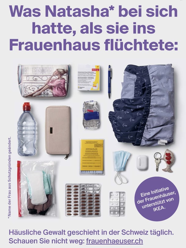 Medikamente, Ausweis, Portemonnaie und kaum mehr – gerade einmal 14 Objekte hatte Natascha* dabei, als sie Zuflucht im Frauenhaus fand. Vier gewaltbetroffene Frauen, die aus ihrer Situation ausbrachen, zeigen für die neue Kampagne der Dachorganisation der Frauenhäuser Schweiz und Liechtenstein (DAO), welche Gegenstände sie auf ihre Flucht mitnahmen. Die Kampagne ist erste gesamtschweizerische Öffentlichkeits- und Sensibilisierungskampagne zu häuslicher Gewalt. Sie soll das Thema ins öffentliche Bewusstsein rücken und die Politik zum Handeln bringen.