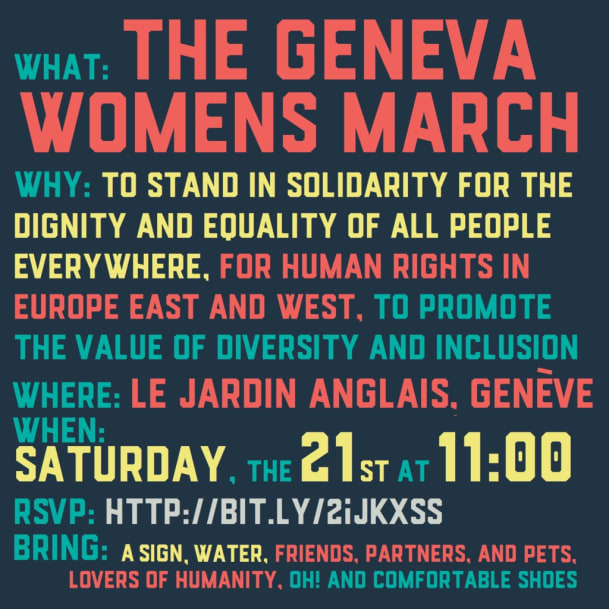 – Der Geneva Women’s March for Dignity beginnt am 21. Januar um 11 Uhr im Englischen Garten Genf. Alle Teilnehmerinnen und Teilnehmer sollen Plakate, Wasser, Freunde, Partner, Tiere, Menschenfreunde und (unbedingt!) bequeme Schuhe mitbringen!