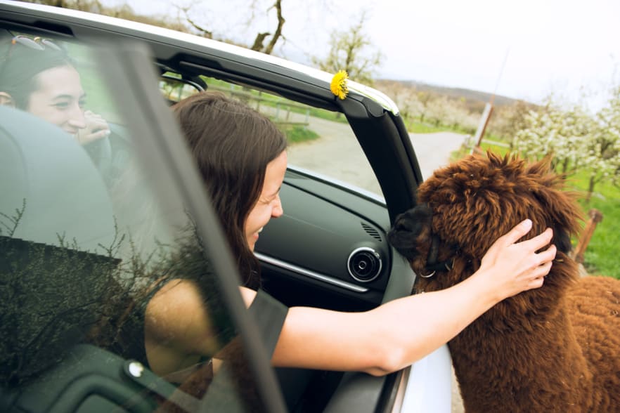 In Frenkendorf BL sehen wir über den grauen Autobahnplanken Dutzende weisse Kugeln auf der Wiese: opulent blühende Obstbäume. Wir gehen rasant von der Autobahn ab – die Bremsen funktionieren sehr gut –, rauf auf den Hügel und fahren auf der Landstrasse weiter zum Bienenberg. Dort stossen wir auf weite Wiesenteppiche, kurvige Strassen und zwei wunderbar weiche Alpacas. Sie machen sich gerade mit ihrer Besitzerin für einen Spaziergang bereit und schauen irritiert auf das offene Auto. Aber weil sich ihnen unsere Hände entgegenstrecken, kommen sie ganz nahe, stecken ihre Nasen zu uns herein und beschnuppern uns. Es ist der Wendepunkt. Nun lernen wir die Oben-ohne-Freude kennen, die Freude an der Teilnahme an der Umwelt – auch wenn jetzt die Wolkendecke immer dichter wird. Im Wald steigt uns würziger Bärlauchduft in die Nase, wir pflücken ein paar Blätter. Wir hören die Vögel singen, und wir grüssen Spaziergänger aus unserem Auto heraus. Und immer dieses Lüftchen im Gesicht.
