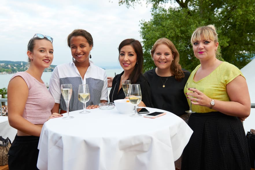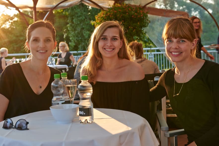 Drei schöne Ladies in der Abendsonne: Elena Barth (l) und Tassja Dâmaso (m) von Pink Box mit Louisa Gisler, Product Manager Lesermarkt annabelle