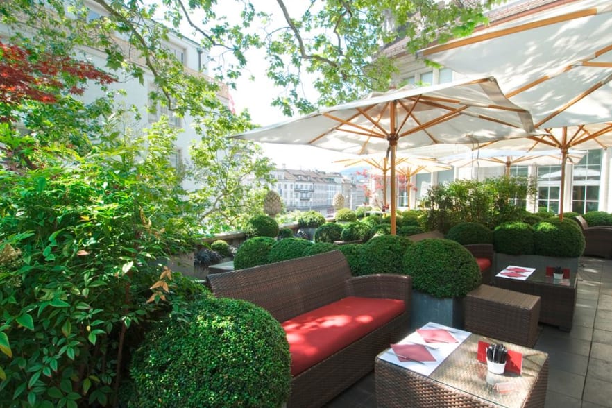 Die Terrasse des Grieder-Hauses am Zürcher Paradeplatz bietet einen herrlichen Garten, hoch über den Strassen der Stadt. Fahren Sie mit dem Lift in den obersten Stock und geniessen Sie eine Auszeit vom hektischen Treiben. (Griederbar, Bahnhofstrasse 30)