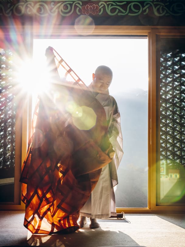 Auf ihre unerwartete Zusage für das Buch folgte die Corona-Pandemie, sodass ich erst im Frühling 2022 nach Südkorea reisen konnte. Obwohl ich mich vorbereitet hatte, indem ich Bücher über den Zen-Buddhismus las, war es schwer eine Vorstellung davon zu bekommen, was mich dort erwartete. Ich bezog ein Zimmer im Kloster, es war leer. Ich bekam zwei Decken, eine war für den Boden und die andere, um mich zuzudecken. Weil der Untergrund so hart war, habe ich mir aus all meinen Kleidern eine Art Bett gebaut.