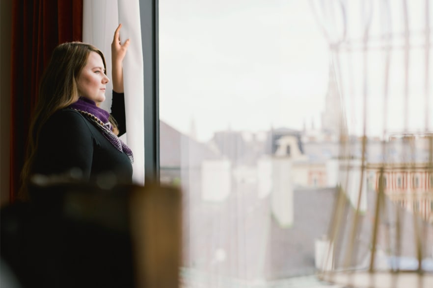 Zum Gespräch platziert sich Natascha Kampusch so, dass der Blick in den blassen Winterhimmel abschweifen kann. Nach wenigen Minuten bittet sie ihre beiden Begleiter, das Zimmer zu verlassen. Sie fühle sich sicher genug, um allein Rede und Antwort zu stehen.