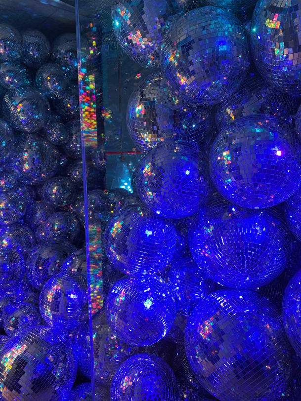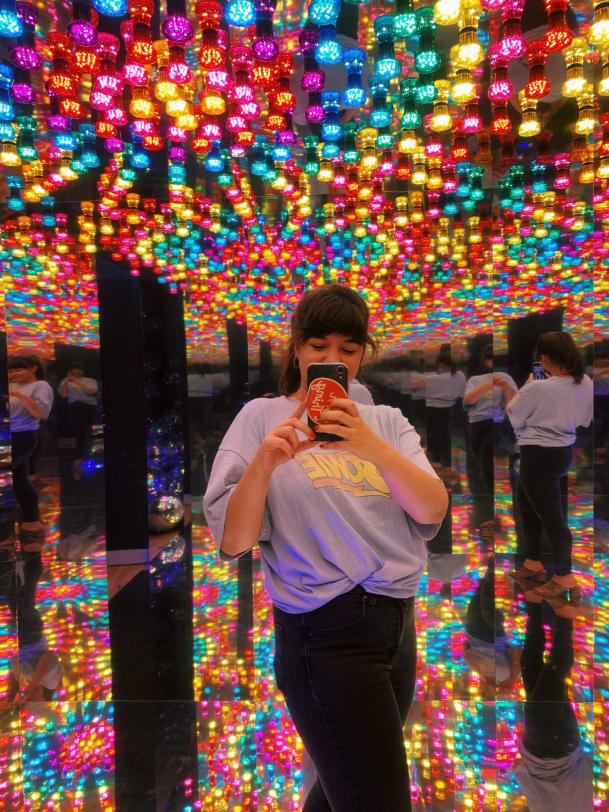 Die verschiedenen Foto-Spots befinden sich jeweils in einem eigenen umgebauten Hotelzimmer. Für die volle Experience erhalten wir eine Zimmerkarte, mit der sich alle Räume öffnen lassen. Um bei unserer Foto-Session ungestört zu bleiben, gibts ausserdem ein "Selfie in Progress"-Schild, das wir an die Tür hängen können. Wir fangen im Spiegel-Zimmer an und bewundern die Kulisse, an der Decke leuchten bunte Lämpchen. Wir wissen nicht so recht, was wir tun sollen. Selfie, allein, zu zweit? Wir knipsen im stillen Raum ein bisschen verhalten unsere Bilder und gehen zum nächsten Selfie-Spot.