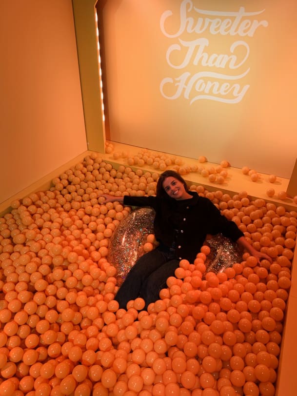 Im orangen Bölleli-Bad, ganz im Honig-Motto gehalten, werden wir etwas lockerer. Schnell merken wir, welche Räume Spass machen – und welche weniger. Einige Zimmer sind interaktiver gestaltet, als andere: Eines ist quasi ein lebensgrosses Ausmal-Buch und das Malen an den Wänden ist erlaubt und erwünscht. Wir kritzeln ein bisschen und erklären den Raum zu einem unserer Favoriten. Oder aber der Glitzer-Raum, in dem schimmernde Lametta-Vorhänge hängen. Hier kann man mit Glitzer-Konfettischnipseln um sich schmeissen – und wer bitte will nicht mit Glitzer-Konfettischnipseln um sich schmeissen?