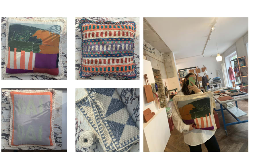 Seit 14 Jahren gibt es Ikou Tschüss bereits! Das Duo hinter dem Label, Guya Marin und Carmen D'Apollonio, teilt die Leidenschaft für handgefertigte und nachhaltige Produkte. Die Verwendung von Naturfasern und Recyclingmaterialien ist seit Beginn ein wesentlicher Bestandteil der Kollektionen, sozusagen der Kern der Marke. So bestickt Guya in ihrem Atelier an der Ankerstrasse jedes Kissen von Hand – und fertigt dabei entzückende Einzelstücke. Auf meine Frage, wie lang es dauert, bis ein Kissen bestickt ist, antwortet Guya gelassen: Kommt ganz drauf an – einen Tag bis eine Woche.