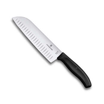 Das Santokumesser verbindet Schweizer Präzision mit fernöstlicher Form. Die gerade Klinge eignet sich zum Schnetzeln von Gemüse, Fisch und Fleisch, der Kullenschliff verhindert das Anhaften.