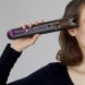 - Den Dyson Corrale waagerecht zur Haarsträhne ansetzen, mit der anderen Hand an der Spitze grade halten, den Haarglätter in Richtung des Gesichts einmal um die eigene Achse drehen und dann langsam zum Ende der Strähne gleiten lassen.