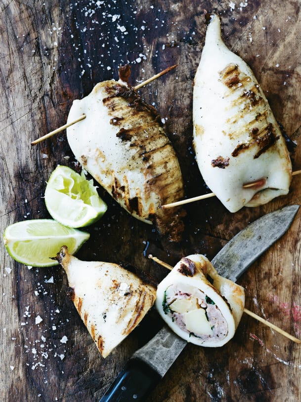 Farce in die Tintenfischmäntel füllen, aber nicht zu fest stopfen, damit sie beim Grillieren nicht aufplatzen. Tintenfische an beiden Enden mit Spiessen verschliessen.