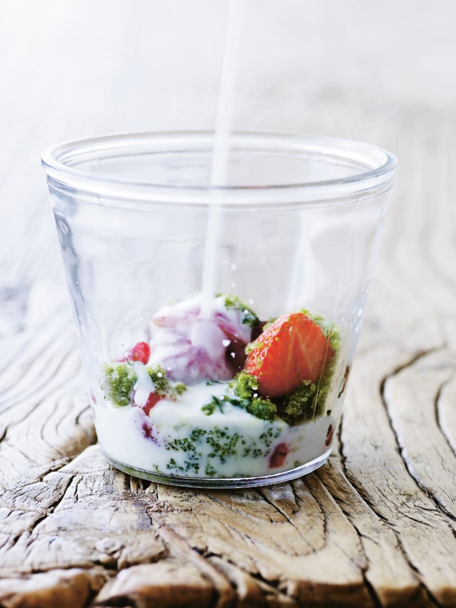 Erdbeeren mit Estragonzucker und Milch
