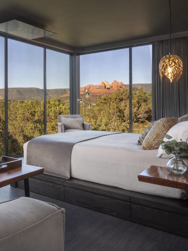Es ist ein bisschen wie fernsehen, wenn man in einem der Betten im "Ambiente " in Sedona in Arizona liegt, sehr meditatives Fernsehen. In der Ferne türmen sich die berühmten roten Felsen auf, darüber spannt sich der stahlblaue Himmel. Das Hotel besteht aus vierzig würfelförmigen Häusern, die auf Stahlpfeilern stehen. Die verspiegelten Fassaden bestehen aus bronzefarben getöntem Glas und karminrotem, verrostetem Metall. In der Abenddämmerung schimmert die Landschaft in allen Rottönen, und die reflektierenden Wände des "Ambiente" tun ihr Bestes, um das alles noch zu vervielfachen. Wer diesem Farben-Festival nicht nur durch die Scheibe, sondern ganz unmittelbar zuschauen oder einfach nur sünnele will, steigt auf die eigene kleine Dachterrasse, über die fast jedes Häuschen verfügt.