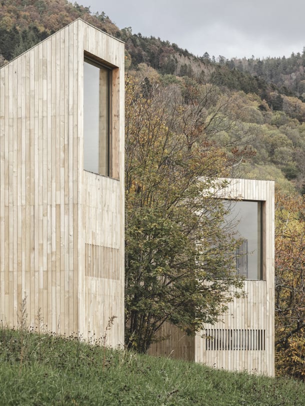 Wir kennen Hygge, die dänische Philosophie des Sich-Wohlfühlens. Aber Hytte? Minimalistisch, hölzern und naturnah haben es die traditionellen skandinavischen Ferienhäuschen dem dänischen Landschaftsarchitekten Emil Leroy-Jönsson schon lang angetan. Am Hang über dem elsässischen Dorf Breitenbach interpretiert er sie neu und nachhaltig: Wie luxuriöse Spielklötze sind dort 14 Hytten aus lokalem Kastanienholz verteilt. Genau wie ihre Vorbilder sind sie Zufluchtsort mit reichlich Freiheit – ausgestattet mit eigenem Whirlpool und riesigen Fenstern, die den Blick auf die unendlich scheinenden Hügel des Elsass freigeben. Auch im biologischen Restaurant des Hotels, wo mit saisonalen Zutaten fermentiert, geräuchert und getüftelt wird, ist die Natur Königin.