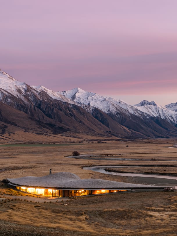 So zart sich dieses Dach wölbt, so sanft sollen nach und nach auch die Energiewellen schwingen, wenn man im "The Lindis" einkehrt. Einen Moment der Stille soll man hier erleben. Eine Auszeit aus dem stressigen Alltag. Inmitten der zerklüfteten und geschützten Natur im unberührten Ahuriri-Tal auf der neuseeländischen Südinsel trifft Luxus auf Landschaft. Die fünf mit viel dunklem Holz und edlen Materialien eingerichteten Suiten schlängeln sich entlang der kurvigen Fassade. Sie wurden alle so positioniert, dass man durch die raumhohen Fenster möglichst viel zu sehen bekommt. Ohne das Zimmer zu verlassen wird man so Teil der Natur. Und natürlich auch bei den unzähligen Ausf lügen, die das Hotel anbietet – auf dem Pferderücken, zu Fuss, im Velosattel oder sogar im Segelflugzeug.