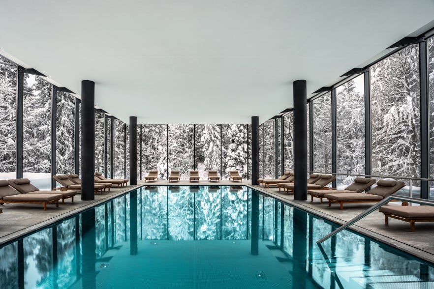Da liegt man im Bikini auf den hölzernen Liegestühlen, vor einem das türkise Wasser des Pools und nur wenige Meter entfernt stehen dick eingeschneite Tannen. Der Wellnessbau des Hotels Waldhaus Flims, der wie eine Glasbox über einem Naturteich und einem Aussenbecken zu schweben scheint, wurde, wie die ganze Anlage, unter dem amerikanischen Investor im Zuge der Neueröffnung vor fünf Jahren einem Make-over unterzogen. Daneben setzt man im Hotel heute auf plüschiges Interieur, Schweizer Kunst und in zahlreichen Zimmern hübsch eingefasste Cheminées. Wer aus dieser kuscheligen Wärme ausbrechen will, der tut das auf den nahen Pisten – oder im Naturteich, der nach der Sauna eiskalte Erfrischung bietet. Und der übrigens im preisgekrönten Film "Youth" auch Harvey Keitel und Michael Caine ein wohliges Erlebnis beschert.