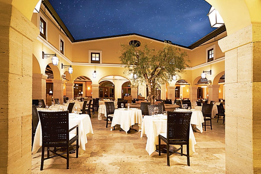 Das Restaurant, das wie eine romantische Piazza gebaut wurde. Jeden Abend habe ich die Qual der Wahl, mich für fünf Gänge zu entscheiden – fast alles traditionelle toscanische Gerichte. Auch der Wein stammt selbstverständlich aus der Region – Gourmetgenuss pur.